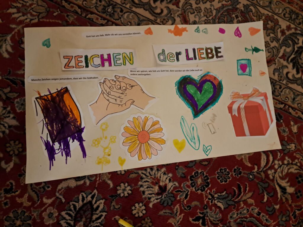 Um Zeichen der Liebe ging es in der Kinderkirche am Muttertag. Weil Gott uns liebt, sollen auch wir einander lieben. Aber wie kann man das zeigen? Auf einem Plakat wurden Möglichkeiten, Liebe zu zeigen, gesammelt.