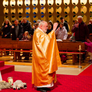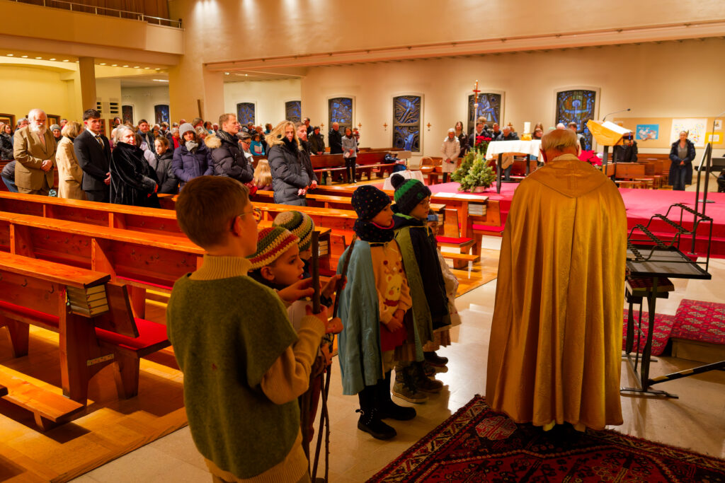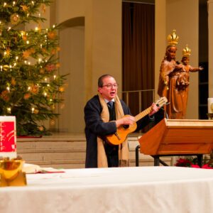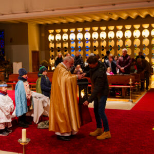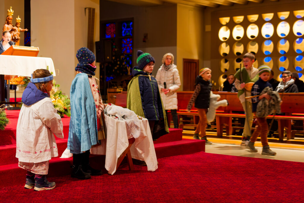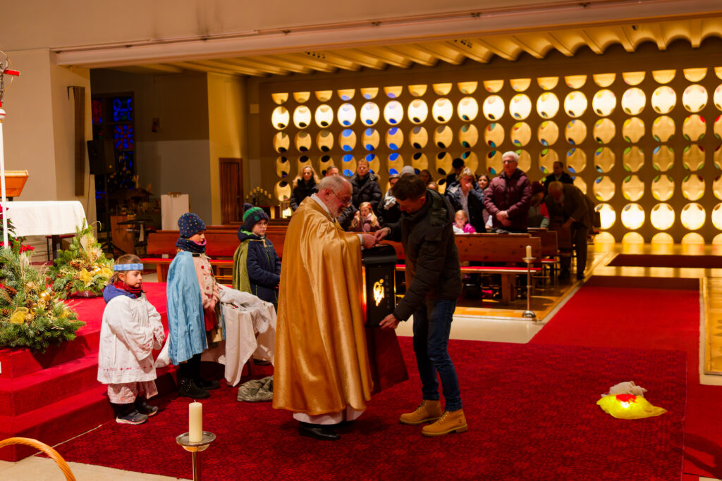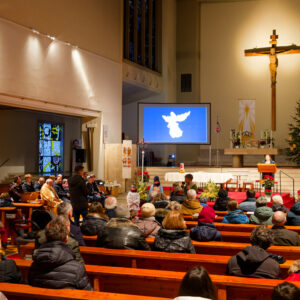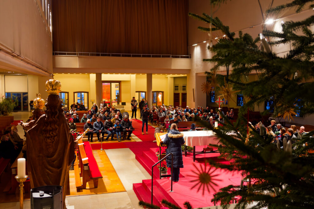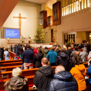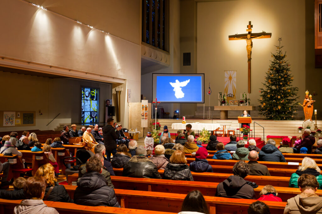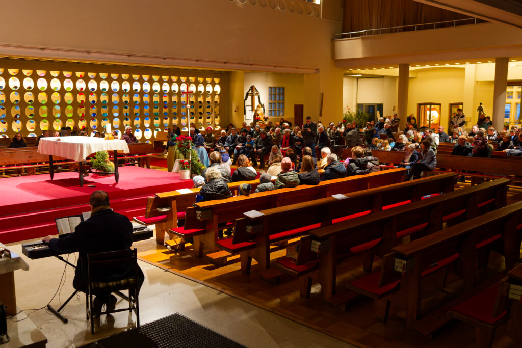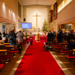In der Mitte der Nacht versammelte sich eine große Anzahl von Menschen, um in der Mette die Botschaft von der Geburt Jesu gemeinsam zu hören. Eingestimmt wurde durch das festliche Turmblasen der Blasmusik Don Bosco.