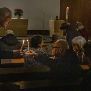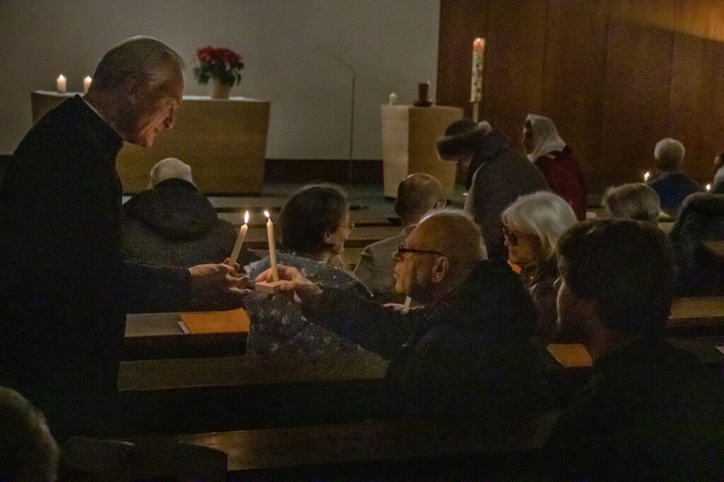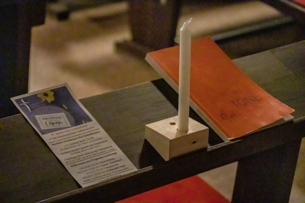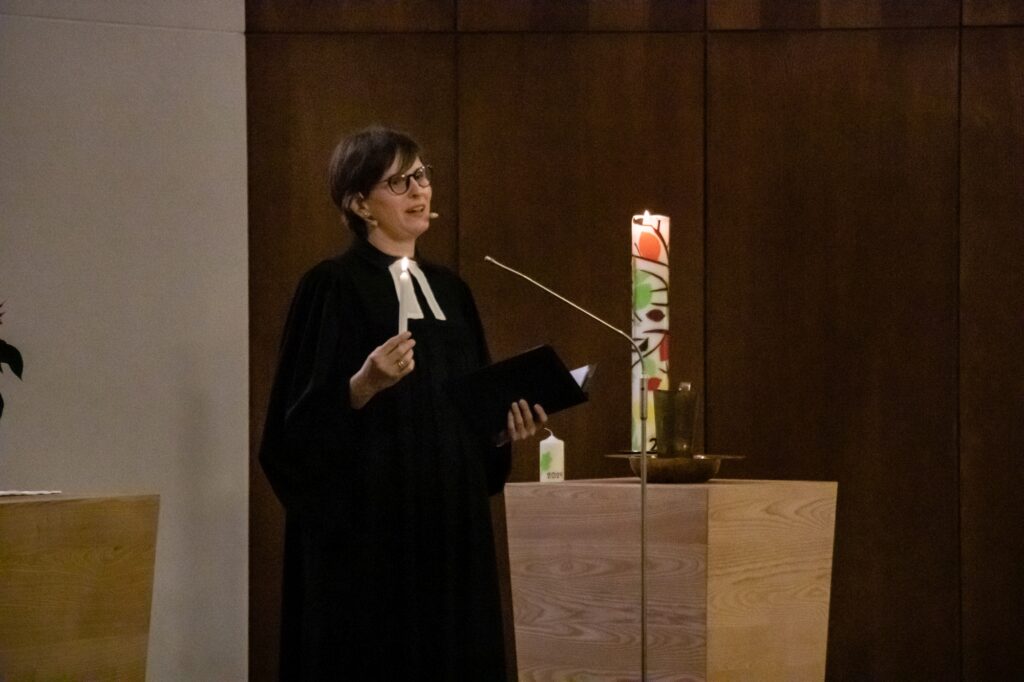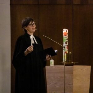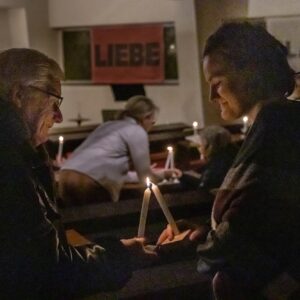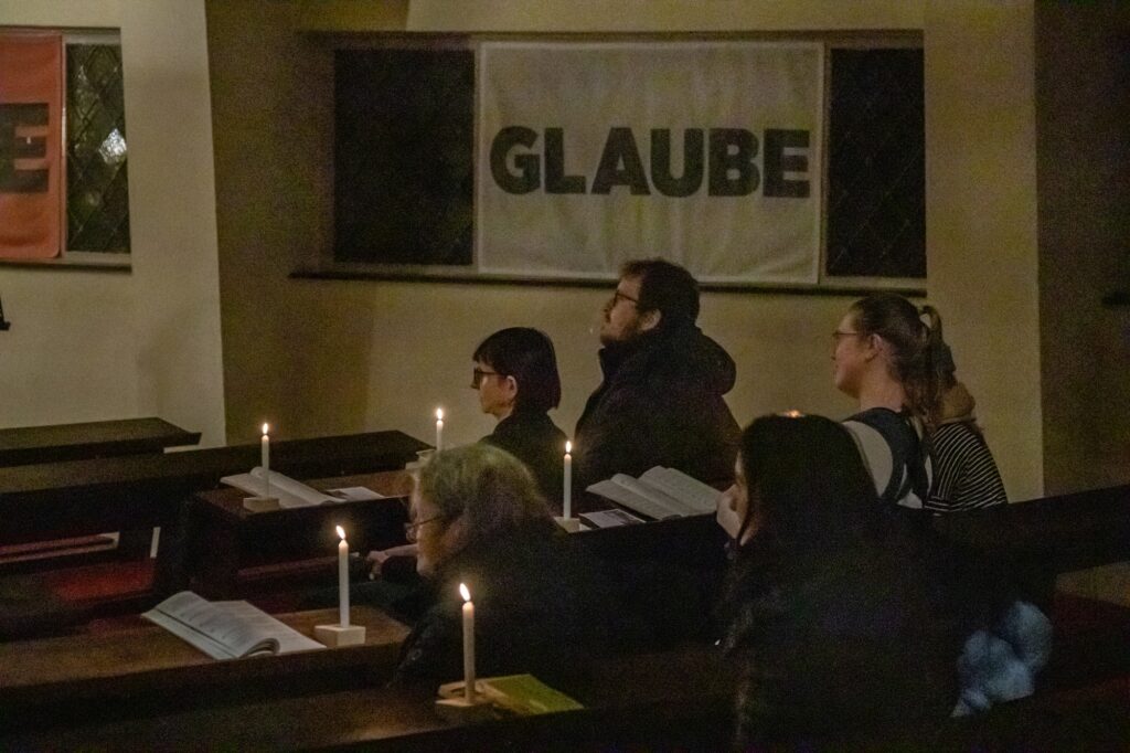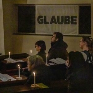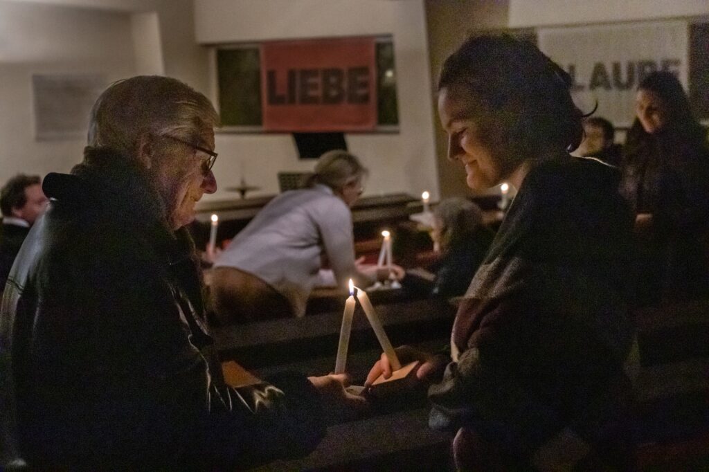 Petri erinnerte beim Entzünden ihrer Kerze an der Osterkerze: “Die Taufe eint uns Christen. Geben wir das Licht mit der Frage ‘Glaubst du?’ einander weiter.” Nach dem ermunternden Aufruf “geschwisterlich” um den Glauben zu streiten und der Bitte, der Kirche eine Stimme in der Gesellschaft zu geben, kamen viele Teilnehmende miteinander ins Gespräch.